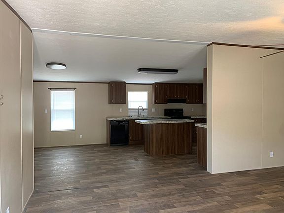 Open concept living room, dining room and kitchen with stove, dishwasher, disposal, refrigerator, large center island with storage.