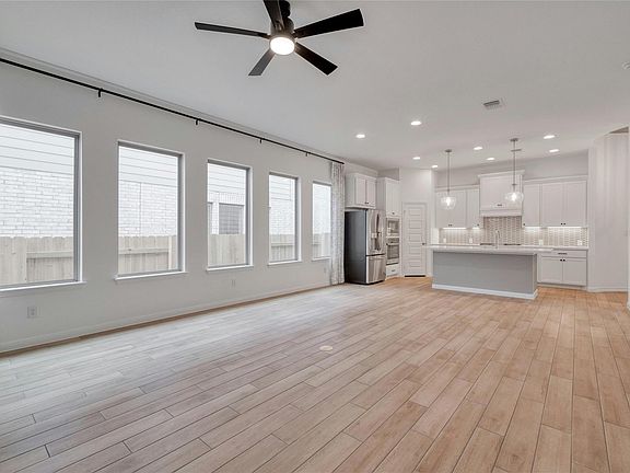 This previous model home is a show stopper full of upgrades! The grand front entry leads past the utility room and mudroom into the open concept floor plan. On the left will be the home office with a French door entry that flows into the large family room and dining area. Kitchen hosts a corner walk-in pantry complete with refrigerator, gas stove, oven, quartz counters and plenty of cabinet space. At the rear of the home is the secluded primary suite which includes oversized windows, en-suite bath with dual vanities, a walk-in closet, linen closet, and a large glass enclosed shower with stunning tile. Secondary bedrooms come with walk-in closets and towering ceilings. Complete with a covered backyard patio, tasteful landscaping for comfort for elevating living, and full irrigation systems included. Don't miss out on the opportunity to call this masterpiece your home!