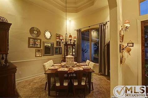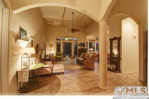 Hill Country Living with all the conveniences. Amenities abound in this 5 BR, 3.5 BA home including barreled ceiling entry, granite counters, art niches, custom tray ceiling treatments, media/bar or game room with 7.1 surround sound, speakers throughout, hand scraped wood floor, designer tile work, balconies with views for miles, heated infinity pool/spa, sport court, cabana bath, outdoor shower, expansive flagstoned outdoor living, outdoor lighting, sprinkler system, and lush landscaping. Must See! Brokered And Advertised By: JB Goodwin, REALTORS Listing Agent: Blain Johnson