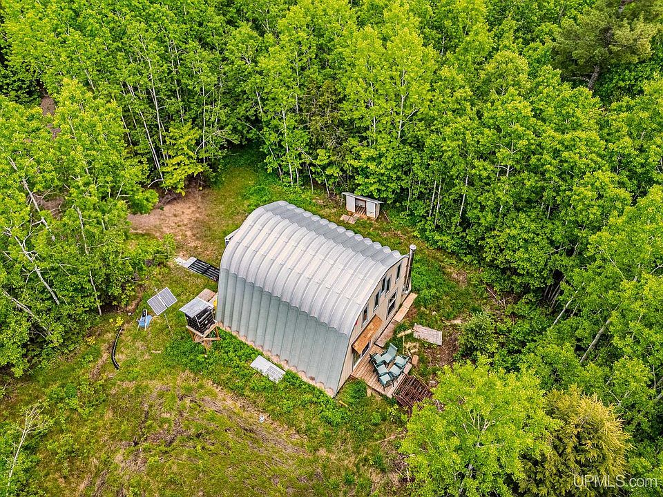 Very unique Northwoods find! Off-grid Sportsman's or nature lover's paradise with all the amenities! This 20-acre property borders Ottawa National Forest on two sides and has a scenic creek flowing into Jackson Creek along the back. Built in 2020, the well-crafted Quonset hut offers a cozy great room with woodstove, kitchen, bathroom with shower and composting toilet, and a spacious loft reached by a spiral staircase. Insulated to R-19 with 3” closed-cell spray foam, it stays comfortable year-round. Power is provided by 6KW generator and solar setup, with rainwater collection for showers. Groomed trails wind throughout, offering hunting, hiking, and peace. A small attached garage stores your ATV or gear. Private, quiet and surrounded by wilderness-yet just minutes from shopping, gas, ski hills and all the Northwoods recreation you love. A perfect retreat for those seeking adventure, solitude and self-sufficient living!