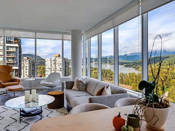 Unobstructed inlet, mountain, and sunset views set the tone in this stunning 2-bed 2-bath+ Den/office with closet, Flex room with French door, Laundry room with sink and folding space. Equipped with A/C, $4K WaterCop Smart Home Leak Detection for peace of mind, over $10K in custom California Closets & screens throughout the unit. Highlights include a chef-inspired kitchen, marble counters /backsplash, gas cooktop, grand breakfast bar, and premium appliances. Dining and expansive living room perfect for entertaining. Primary suite features WIC and spa-like ensuite with heated floors, soaker tub, and frameless shower. 2 EV stalls and a storage. Steps to Skytrain, Resort-style amenities: Clubhouse, outdoor pool, hot tub, sauna, gym, steam room, golf sim, guest room. OPEN HOUSE SUN Oct 5th 2-4