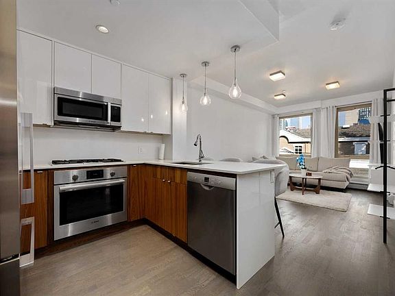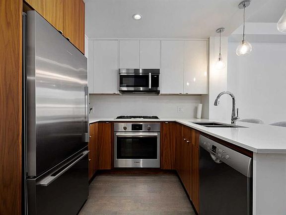 Spacious balconyLarge windowsChic kitchenSleek two tone cabinetryQuartz countertopsGas cooktopFull stainless appliance package