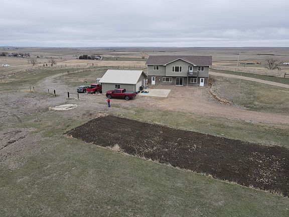 Your Dream Home Awaits on 13.34 Acres with Stunning Views! This spacious, well-maintained home sits on 13.34 acres of lush grass hay/pasture, offering easy upkeep and breathtaking views, including Bear Butte and the Black Hills to the south. Inside, enjoy solid maple doors, low-maintenance windows with Prairie Grill inserts, and an elegant arched wall in the dining area. The kitchen features a convenient island, stainless steel appliances, recessed lighting, and durable laminate flooring. Cozy up with cove heating in the basement, walk-in closets, and a pellet stove. Skylights in the bathrooms bring in natural light and a touch of luxury. The home has 3 bedrooms and 2 bathrooms upstairs, with an additional bedroom and bathroom in the basement. Key updates include foundation work (2013), new A/C (2023), updated power main, and a repoured basement floor. Thoughtful dirt work ensures proper water drainage around the home. The detached, insulated, heated garage with 100-amp service offers great flexibility, while the 70x20 garden space is perfect for growing fresh produce. Located just 1 mile from town and pavement, this home offers peaceful acreage and amazing views, ready for you to move in and enjoy!