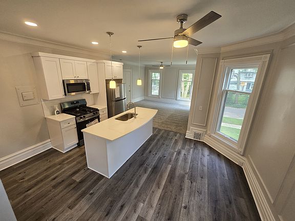Apartment description: Good-sized living room with new carpet. Very large kitchen with plenty of space for a dining area. Distresses wood LVP flooring throughout kitchen and bath areas. New dishwasher, refrigerator, stove and microwave, all stainless! Large kitchen island with bar overhang. Very large bedroom with new carpeting and built in storage/wardrobe with shelves. Semi-private enclosed porch area off bedroom! Lots of character with high ceilings, three ceiling fans, and large sunny windows throughout. Lots of storage, cabinets and built-ins. Off-street parking is included with a covered carport space. Access to basement and coin operated laundry facilities w/private storage area to keep your belongings. Very close to St. Mary's Hospital, Spectrum Hospital/medical mile, GVSU, Kendall, GRCC, and downtown area as well as Wealthy/Cherry shopping/dining corridors (All are walking/biking distance).