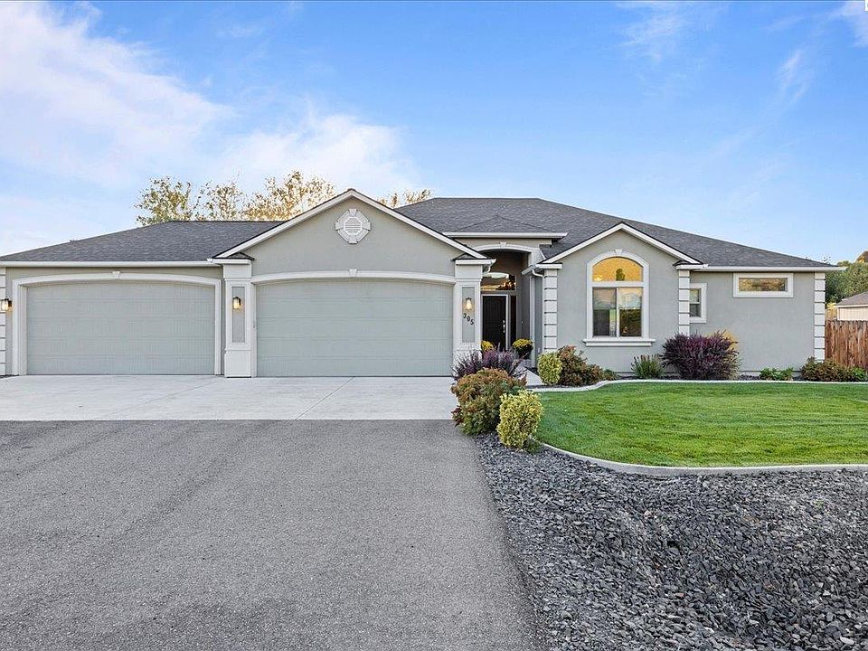 MLS# 264485 NEW LISTING! WOW! So many luxurious features in this highly upgraded home! 5 bedrooms, 4 baths and a 4 car garage! Plenty of room for Multi-generation living at it's finest. Every feature upstairs is duplicated downstairs. Two full kitchens, two family rooms, two laundry rooms, two fireplaces and extensive patio and decks. As you enter the foyer you will find 11 foot ceiling heights and abundant natural light. There are lovely hardwood and tile flooring in the living room, dining room, hallways, kitchen and the first floor laundry room. The family room features floor to ceiling built-ins, an 80' flat screen television and large windows overlooking the .83 acre flat lot perfect for a pool or shop! A large crystal chandelier is showcased in the formal dining room and the entire back of the home offers views of the fully fenced yard, sport court, built in firepit and shed. The chef's kitchen is sure to delight! The kitchen features beautiful granite countertops, large island with cabinets on both sides, stainless steel appliances, two ovens and crystal chandelier pendant lights. A dream kitchen by any standard. The master bedroom bathroom suite showcases an oversize built-in soaker tub, glass enclosed walk in full tile shower, large walk in closet, dual sinks and separate water closet. There is natural light from the high set windows, granite counters and a serene cool light grey and beige color palette. Combined with the private balcony it feels as though you have entered a spa. There is a second bedroom on the main floor that could be utilized as the perfect home office. This second bedroom on the main level features a vaulted ceiling, a generous closet and large window overlooking the front yard. Downstairs you will find 9' tall ceilings, windows along the entire back of the home and lots of natural light. You will delight in the spaces available on the lower level. The lower level family room features a wall of built ins, large windows and access to the backyard. This home offers plenty of storage closets throughout. The two full bathrooms on the lower level feature granite countertops and one of them offers dual sinks. For the true movie lover in your family there is a dedicated theater room. The room that brings the benefits and flexibility of this executive home together is the lower level full size kitchen with dining space. The second kitchen has granite counters, high end dark wood cabinets, tile flooring and backyard access.