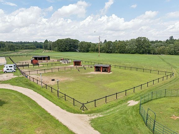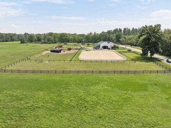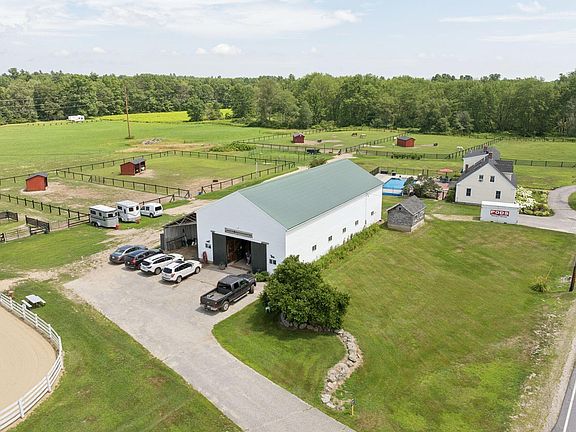 Nestled on 17 picturesque acres along the scenic Saco River, Rivers Edge Farm is a turnkey equestrian property offering unmatched beauty & functionality. With 1,000 feet of river frontage & open, fertile land, this unique farm provides the perfect setting for both horse enthusiasts & nature lovers. At the heart of the property is a thoughtfully designed 10-stall barn featuring 12'x12' rubber-matted stalls, two spacious tack rooms, & a hayloft capable of storing up to 2,500 bales. The farm produces its own hay from 10 acres, yielding approx.. 1300 bales per season. A 100' x 200' professionally footed arena ensures an ideal surface for training. Turnout is abundant with 9 paddocks, 7 run-in sheds, & 2 summer pastures—comfortably supporting up to 22 horses. A charming miniature barn, modeled after the main house, is perfect for minis or donkeys. Water hydrants & electricity in the barns & paddocks provide effortless daily management. The updated 1794 farmhouse offers 4 bedrooms & 2 full baths, blending historic character with modern amenities. The gourmet eat-in kitchen features granite countertops, an island, induction cooktop, SS appliances, & wood-burning fireplace. A dining room with a wood stove opens via French doors to the backyard oasis—complete with lush gardens, a patio, & a heated in-ground pool. Inside, the fireplaced family room, living room, & flexible first-floor bedroom share a full bath with laundry. Upstairs, find 3 more bedrooms, an office area, & another full bath—ideal for family or guests. Beyond the fields, a private dock on the river invites boating, swimming, or quiet evenings by the fire pit. The open terrain includes cross-country obstacles for training or casual rides. A shaded campsite beneath one of Maine's oldest shagbark trees offers a second fire pit & a tranquil retreat. Currently operating as a boarding stable, it is home to a select group of well-mannered horses & their equally easygoing owners. This exceptional property has it all.