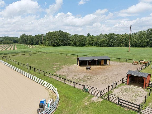 Nestled on 17 picturesque acres along the scenic Saco River, Rivers Edge Farm is a turnkey equestrian property offering unmatched beauty & functionality. With 1,000 feet of river frontage & open, fertile land, this unique farm provides the perfect setting for both horse enthusiasts & nature lovers. At the heart of the property is a thoughtfully designed 10-stall barn featuring 12'x12' rubber-matted stalls, two spacious tack rooms, & a hayloft capable of storing up to 2,500 bales. The farm produces its own hay from 10 acres, yielding approx.. 1300 bales per season. A 100' x 200' professionally footed arena ensures an ideal surface for training. Turnout is abundant with 9 paddocks, 7 run-in sheds, & 2 summer pastures—comfortably supporting up to 22 horses. A charming miniature barn, modeled after the main house, is perfect for minis or donkeys. Water hydrants & electricity in the barns & paddocks provide effortless daily management. The updated 1794 farmhouse offers 4 bedrooms & 2 full baths, blending historic character with modern amenities. The gourmet eat-in kitchen features granite countertops, an island, induction cooktop, SS appliances, & wood-burning fireplace. A dining room with a wood stove opens via French doors to the backyard oasis—complete with lush gardens, a patio, & a heated in-ground pool. Inside, the fireplaced family room, living room, & flexible first-floor bedroom share a full bath with laundry. Upstairs, find 3 more bedrooms, an office area, & another full bath—ideal for family or guests. Beyond the fields, a private dock on the river invites boating, swimming, or quiet evenings by the fire pit. The open terrain includes cross-country obstacles for training or casual rides. A shaded campsite beneath one of Maine's oldest shagbark trees offers a second fire pit & a tranquil retreat. Currently operating as a boarding stable, it is home to a select group of well-mannered horses & their equally easygoing owners. This exceptional property has it