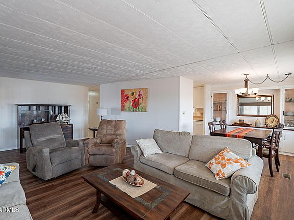 Beautifully remodeled home with lots of style and charm. Your clients will appreciate the numerous upgrades that make this home shine. New interior paint, the exterior siding was removed, and the home was wrapped in a durable cement siding. The kitchen has been upgraded and includes newer kitchen cabinets, upgraded flooring and countertops. The bathrooms look amazing and have newer shower and countertops. Enjoy comfort with a new AC unit, newer light fixtures throughout, and updated flooring that extends into the Arizona Room. Additional features include a gas range/oven, dual-pane windows and a long-lasting metal roof. Property offers a workshop and storage rooms, with most furnishings included pet-friendly community. Located in a vibrant 55+ active community with endless amenities: two bowling leagues, RV camping groups, bocce ball, horseshoes, pickleball, swimming pool, spa, billiards, library, and more. Conveniently close to Superstition Springs Mall, dining, golf courses, and Banner Baywood Hospital.