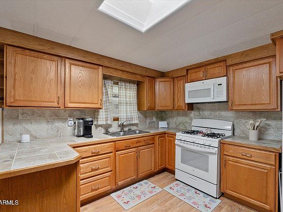 Welcome to this charming 2 bedroom, 1 bath home located in a desirable 55+ community of Saguaro Sun! Recently updated, this home features fresh flooring, modern cabinets, dual-pane windows, and stylish tile countertops with a matching backsplash. The home comes partially furnished, including a large, newer sectional in the living room. The perfect place for relaxing or entertaining. Second bedroom has a Murphy bed w/ new mattress. Outside, you'll find three storage sheds, one equipped with washer and dryer plus a deep freezer that stays with the property. Enjoy Arizona mornings on the extra-large covered patio, an ideal spot for sipping coffee and soaking in the beautiful weather. This home has the updates, space, and comfort you've been looking for!