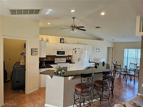 This beautiful 3 bedroom & 2 bathroom home is in absolutely MINT and move-in condition! The roof is brand new & has a transferable warranty. The contemporary kitchen features a large center island with granit counter and bar tops, quality Samsung appliances and a breakfast nook. The great room offers two sets of sliding glass doors towards the spacious covered & screened lanai, a high cathedral ceiling and a formal dining area. The primary bedroom has a large window towards the back yard and a good size walk-in closet. In the primary bathroom you will find dual vanities, a shower with glass doors and a large triangular tub with jets. The two ample sized guest bedrooms share a bathroom that is also accessable from the lanai. In the laundry are a high capacity Samsung washer & dryer, and a built-in closet. The 2-car garage offers plenty of room for your vehicles and storage. Enjoy the huge backyard which is already fenced on both sides and has an automated sprinkler system or add a pool. All city utilies are paid in full. There are several boat ramps where you can launch  your boat for a relaxing day on the water or fishing. Don't delay and and enjoy the Florida lifestyle !!!