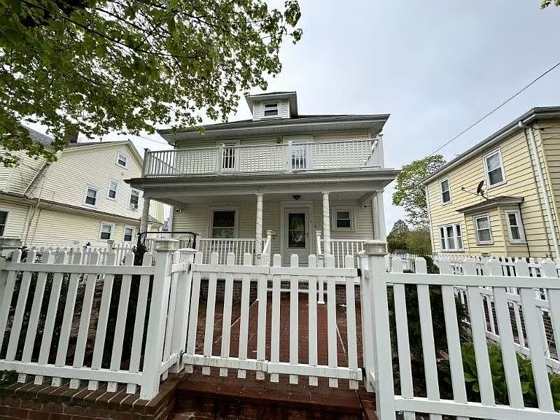 The second floor offers four bedrooms, each with its own closet, plus a full bathroom and access to a balcony overlooking the street.