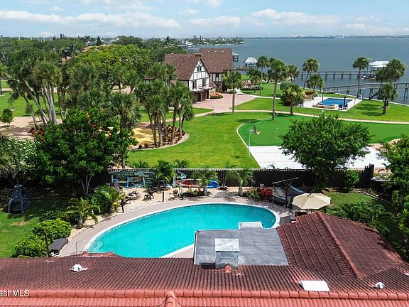 RIVER VIEWS JUST BECAME MORE AFFORDABLE! Tucked away in a Secluded Cul-de-sac, Just 1 lot from the River, this Tropical Riverside Retreat won't last long at this Reduced price! Offering Breath Taking Views of the Intercoastal without the cost of Direct Riverfront! All major expenses have been updated! Spanish tile roof in 2016, 45 ft pool resurfaced w/glass tile redone this year. All three bathrooms recently remodeled with high-end porcelain tile. Re-Piped in 2007. Electrical 2011. New AC 2022. Storm shutters. Spanish Oak Hardwood throughout. Features Expansive In-Law Suite with full Ensuite Bath and Mini Kitchen. Sprinklers updated 2023 on well water. All new Interior Doors, ceiling fans, light fixtures. Balcony on Covered Lanai could easily be added to offer Panoramic River views. Master has a Dressing Area & Sliders that lead to Pool & Private Terrace! Walk to the Beach, Shopping & Restaurants! 45 mins to Orlando & The Theme Parks & Conveniently Close to the Bridge-A-Rated schools!