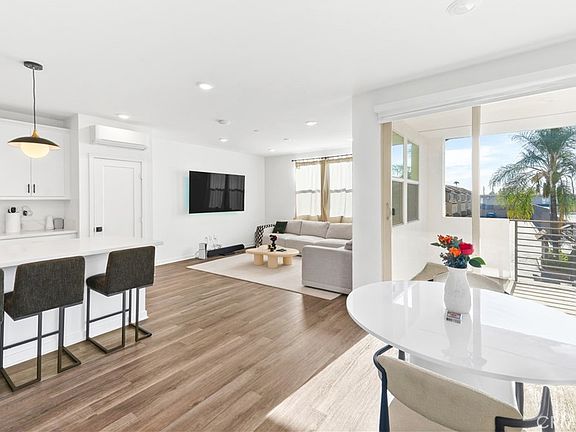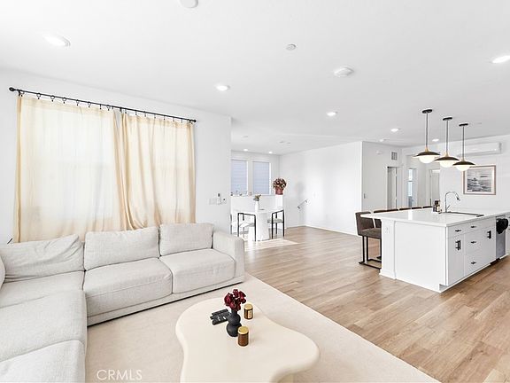 Inside, you're welcomed by a bright and open living space featuring elegant wood flooring, recessed lighting, and expansive windows that flood the home with natural light. The modern kitchen boasts sleek white cabinetry, quartz countertops, stainless steel appliances, and a massive center island with bar seating—perfect for both casual dining and entertaining.