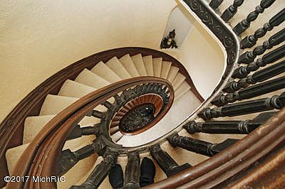 The Isaiah Flagg Home. Stuart Historic District. Very unique French Mansard roof with Renaissance dormer treatments and shingled surface exterior. Many newer improvements. Wonderful block. Beautiful remodeled cherry kitchen with ceramic floors & eating area. Large mud room access. New electric and insulation in sidewalls. Insulation in attic. New roof. Grand living room with original ornate plaster cornice ceiling and newer cherry wood floors. Nearly 12' ceilings throughout main floor & 11' on 2nd floor.10' on 3rd. 2 newer high energy efficient furnaces & central air unit. Large formal dining room with wood floors & floor to ceiling windows. One of the finest & most unique spiral staircases in Kalamazoo - open from marble floor foyer to 3rd floor ceiling. Some finishing work needed.