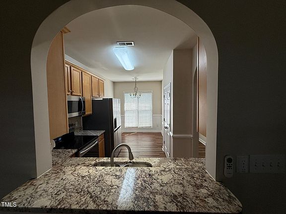 Wake Forest location for this charming 3 bedrm, 2.5 bath townhome. Kitchen with new appliances and opening to dining/living area with bar stool area. Gas fireplace in living room. Sliding glass door opens to screened in porch with outside storage area. Washer/dryer on 1st floor and is a large space with cabinets. Back yard is very quiet with a planter waiting to be tended. Walk to town, PO, Senior Ctr, library. Small dog negotiable, no cats. Available now.