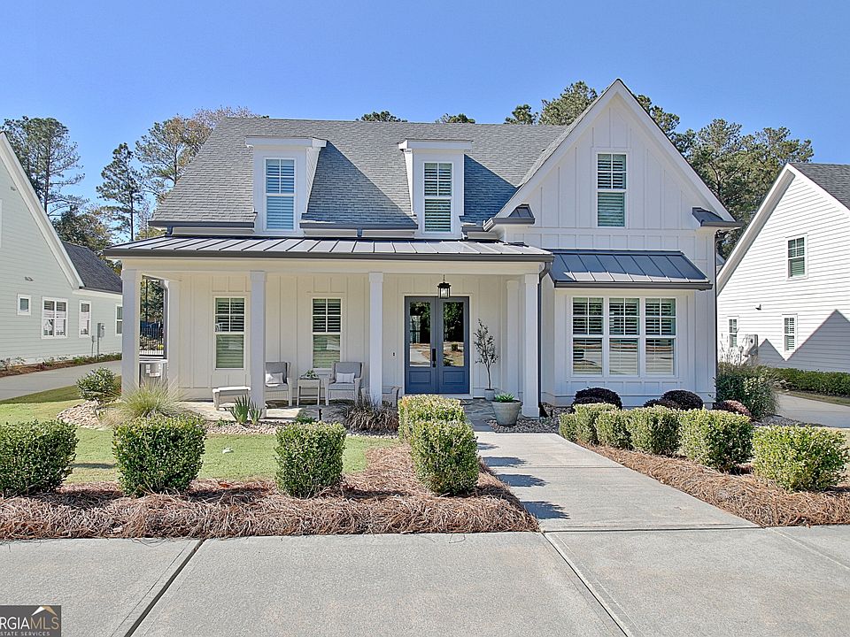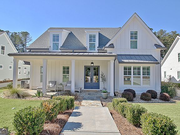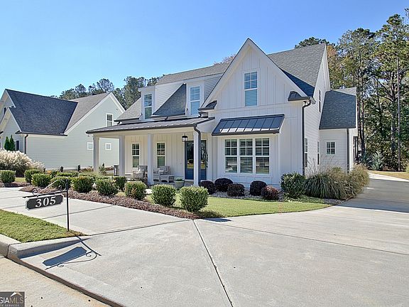 Better than new and beautifully manicured and maintained, this custom home built in 2021 by Joe Cook with JDC Homes showcases Traditional Southern charm with the architectural design of Mitch Ginn. Perfectly located in the Historic District of Downtown Senoia, this thoughtfully designed home offers open living spaces, abundant natural light, and timeless style throughout. The main level features a spacious Primary Suite and a Guest Bedroom along with an inviting Chef's Kitchen complete with custom solid wood cabinetry, granite countertops, double wall ovens, stainless-steel appliances, including the refrigerator. A custom pantry has additional counter space for a coffee bar or service bar. The laundry room is conveniently located next to the three car garage and has custom cabinets above the washing machine and dryer belong with a service sink for convenient clean up. The kitchen and dining area flow seamlessly into the family room-perfect for gatherings and easy entertaining. Upstairs, you'll find a comfortable retreat area including a media space for social gatherings, an en-suite bedroom with private bath, and two additional bedrooms sharing a Jack-and-Jill bath, offering the ideal layout for family or guests. Throughout the home, you'll appreciate beautiful site-finished hardwood floors, tile baths, and custom finishes that reflect quality craftsmanship. Outdoor living is a highlight with a large front porch perfect for relaxing afternoons and a covered rear porch with a cozy fireplace, ideal for year-round entertaining. The oversized driveway and three-car garage provide ample parking and storage. Energy-efficient features include foam insulation and a tankless hot water heater. Sprinkler system for easy landscaping maintenance. Nestled in a sidewalk community of 31 custom homes backing up to neighborhood green space, this property is just a short golf cart ride to downtown Senoia's shops, restaurants, and historic events-the perfect combination of charm, convenience, and comfort.