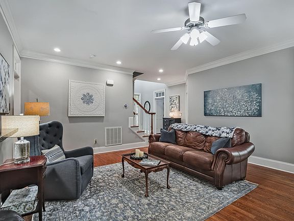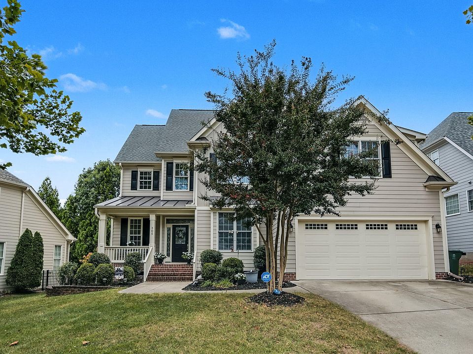Wonderful open floorplan in very desirable West Cary's Hortons Creek. Two story foyer with 2-piece crown molding, transoms, and hardwood floors, extend through much of the first floor. Family room has a fireplace (gas logs), ceiling fan, and an abundance of natural light opens to the breakfast area and gourmet kitchen. Kitchen features Cherry cabinets, undercabinet lighting, tiled backsplash, GE Profile gas cooktop with telescoping vent, wall convection oven, microwave, dishwasher, and refrigerator...all stainless-steel appliances. Additional features include recessed lighting, granite counters with eat-in bar, center island, breakfast area with side office nook, and large walk-in pantry. Formal dining room with 2-piece chair, shadowbox wainscot, and butler's pantry. First floor office with built in bookshelves, gas logs fireplace, ceiling fan, and 2-piece crown. Sunroom has tiled floors and ceiling fan. Large second floor master bedroom with tray ceiling, ceiling fan, master bath with tiled floor, tub, tiled shower, and walk-in closet. Large 5th bedroom over garage could be bonus room. 3rd floor walkup attic with windows on all 4 sides, great for storage or future expansion. Second floor HVAC replaced in 2016 includes a UV light-based air purifier and First floor HVAC replaced in 2023 with a REME HALO whole home air purification, (total cost of $24K). Tankless Rinnai water heater (2016). 12 mil vapor barrier in crawl space. Fenced back yard. Neighborhood pool. Excellent location, convenient to Research Triangle Park, RDU Airport, Raleigh, Chapel Hill, and Durham.
