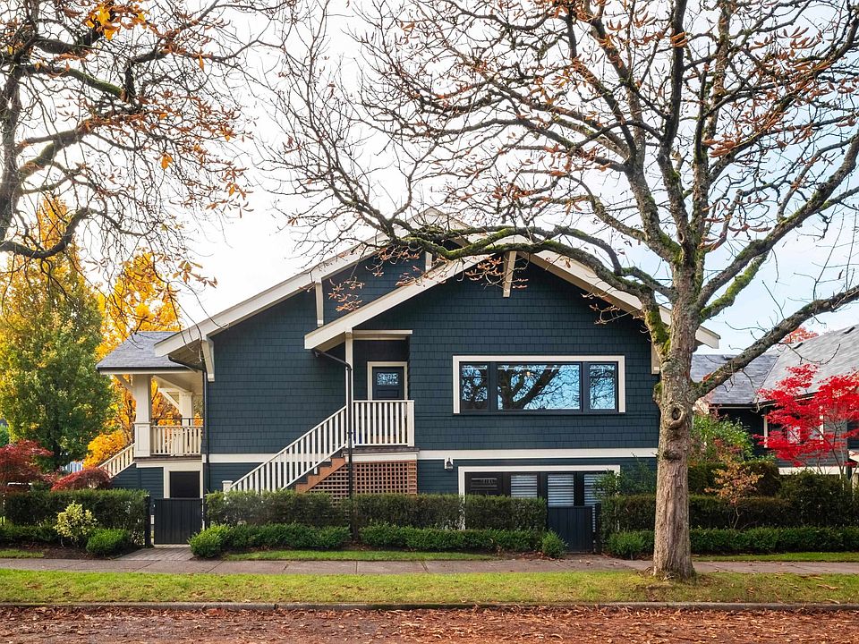 'The James': Where 1918 Heritage grace meets contemporary elegance. This home presents a restored heritage facade, including its signature covered porch, complemented with a modern interior. The main floor is a family's dream, defined by soaring ceilings, a gourmet kitchen and a spacious dining room ideal for entertaining & large gatherings. Antique brick feature wall and bespoke millwork add charm to the living space. 3 generous bedrooms on the main floor, w/ the addition of an expansive 4th bedroom suite on the upper level- A private space for guests w/ walk in closet. Exterior is beautifully landscaped with a fenced lush garden/yard. Single car garage EV ready, and secure bike storage. Enjoy unparalleled proximity to schools, transit and the finest shopping and dining in Cambie Village!