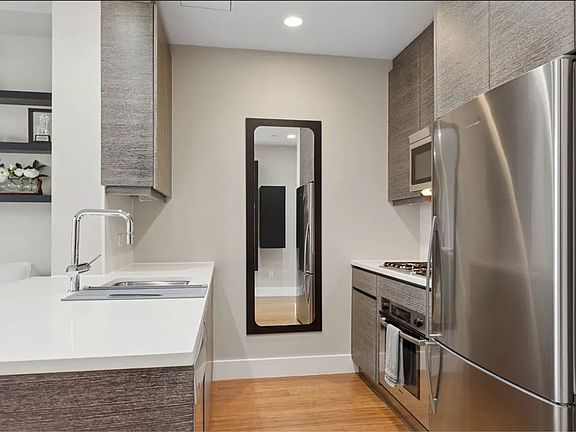 This spacious and quiet residence features triple-pane windows, carbonized bamboo floors, and an open kitchen with Caesarstone countertops, Italian Wenge cabinetry, and premium Bosch and Fisher & Paykel appliances. The spacious living room and bedroom both frame the Empire State Building, offering an iconic Manhattan backdrop.