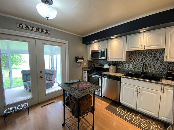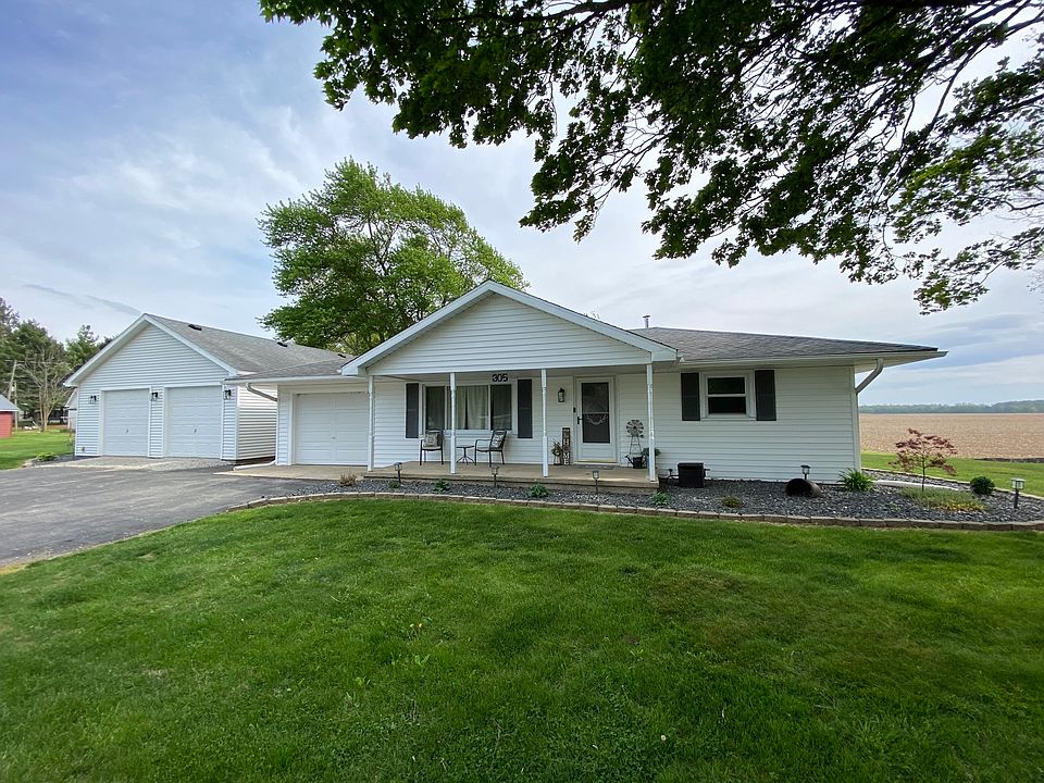 Great location on the edge of Waynetown. This cute two-bedroom ranch has a full basement with an attached one car garage and an additional oversized two car detached garage. Kitchen has updated cabinets with granite countertops and tile backsplash. Stainless steel appliances included. The kitchen has a slider that opens into the sun porch which allows for warm breezes and peaceful views of the backyard. Home has been well maintained. Full basement with private access has an extra bathroom and an additional room they use for a bedroom. New furnace in fall of 2018, New water heater in 2021, New A/c unit 2022, 4 exterior doors replaced this year. Updated landscaping 2020. Location allows for a quick access to I-74