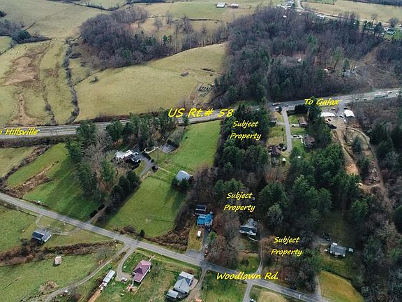 LOCATION, LOCATION!! Lovely 3 bedroom/2 bath vinyl sided home and 4 acres that fronts on Woodlawn Rd. and US Rt.#58 East! The original house was built onto adding a large great room, full bath and kitchen/dining combo. There is a bonus room currently being used as an additional bedroom and partial hardwood floors. Home is served by a private well & septic system; however, public water is available. The 4 acres is mostly wooded, lays well and has a spring branch running through the front yard. Numerous outbuildings, a metal 2 car carport and an open deck with screened in porch. Great residential or business opportunity in a very convenient location between Hillsville and Galax and only minutes from I-77!
