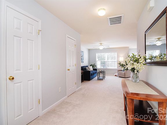 WELCOME TO THIS LOVELY WELL-MAINTAINED townhome in Hanover of Indian Land/Fort Mill! Covered front porch entry into spacious foyer & open floor plan living, dining & kitchen w/great natural light & recessed lights. Half-bath on main for guests! Access to private patio w/neighboring fences & tree area view. Upstairs a spacious primary suite awaits w/cathedral ceiling & fan, walk-in closet, addtl. storage closet & bathroom w/granite countertop vanity, custom tile floor, lg. walk-in shower & separate water closet w/linen closet. The light-filled upper hallway has a laundry closet w/shelves & washer/dryer that convey! Secondary bedroom w/cathedral ceiling & fan, walk-in closet & ensuite bathroom w/shower/tub combo, custom tile floor & linen closet. Coveted one-car garage is easy access from kitchen. Lawn maintenance is included in HOA fee. With community pool & playground & proximity to so many venues for shopping & dining, this is a MOVE-IN READY GEM! Showings begin Thursday, May 15th!