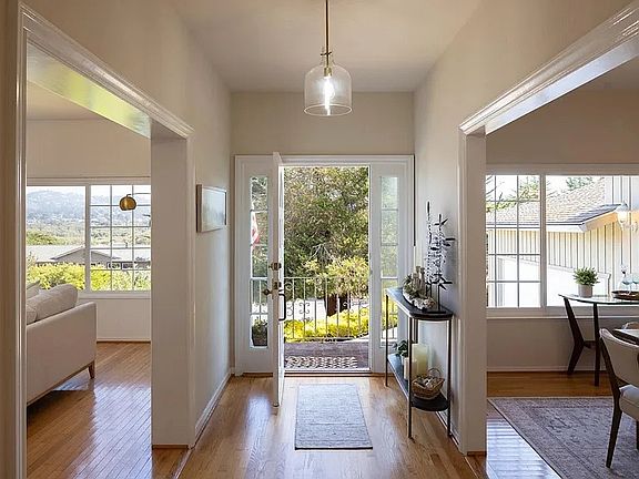 This charming home is ideally located in Carmel Meadows - walking distance to Carmel River Beach, a short drive to majestic Point Lobos and downtown Carmel-by-the-Sea, and in the Carmel School District. With 3 bedrooms and 2 bathrooms, the spacious and progressive floor plan has a light and airy design. Take in gorgeous views from the living and dining rooms expanding from the Mission Ranch to the Santa Lucia Mountains. Relax in the spacious living room featuring a large traditional wood burning fireplace with a custom mantle designed with local reclaimed wood, that flows effortlessly into the dining room and kitchen and hearth room. The cozy wood burning fireplace with hearth seating creates an inviting backdrop to this large gathering space, featuring a breakfast nook with east views, a kitchen island with seating, and additional peninsula seating. The primary suite opens up to a multi-use sunroom that expands the room and provides a sheltered outdoor space for a variety of activities and gatherings. This bonus space is surrounded by gardens and fire pit area with classic terra cotta pavement. With beautifully maintained hardwood floors, new washer, dryer, dishwasher, refrigerator, stove, and furnace, this special home is ready to live in and enjoy the Carmel Coast lifestyle.