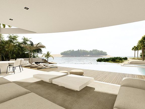 This organic modern jewel on a walled and gated lot along Billionaire's Beach takes privacy, security and world-class amenities to a whole new level. Three of them, in fact. The ultimate beach house (now under construction and slated for completion in the spring of 2026), new Villa Tropezina is being masterfully developed by Sabal Development and artfully crafted by Sabal Luxury Builders, both under the direction of Pascal Nicolai. It was beautifully designed by Togu Architecture. Ensconced on a lush linear sloping lot that extends from a pristine Atlantic Ocean Beach to a secluded Intracoastal inlet, this fluid, light-infused, three-story smarthouse juxtaposes organic finishes and creamy natural tones with modern design to create a zen-like serenity. From its water garden side entry and floor-to-ceiling sliders to its tiered water-view terraces and the Saint Tropez vibe of its beach-side cabana, this estate skillfully complements its island environ, while seductively blurring the line between indoor/outdoor living.