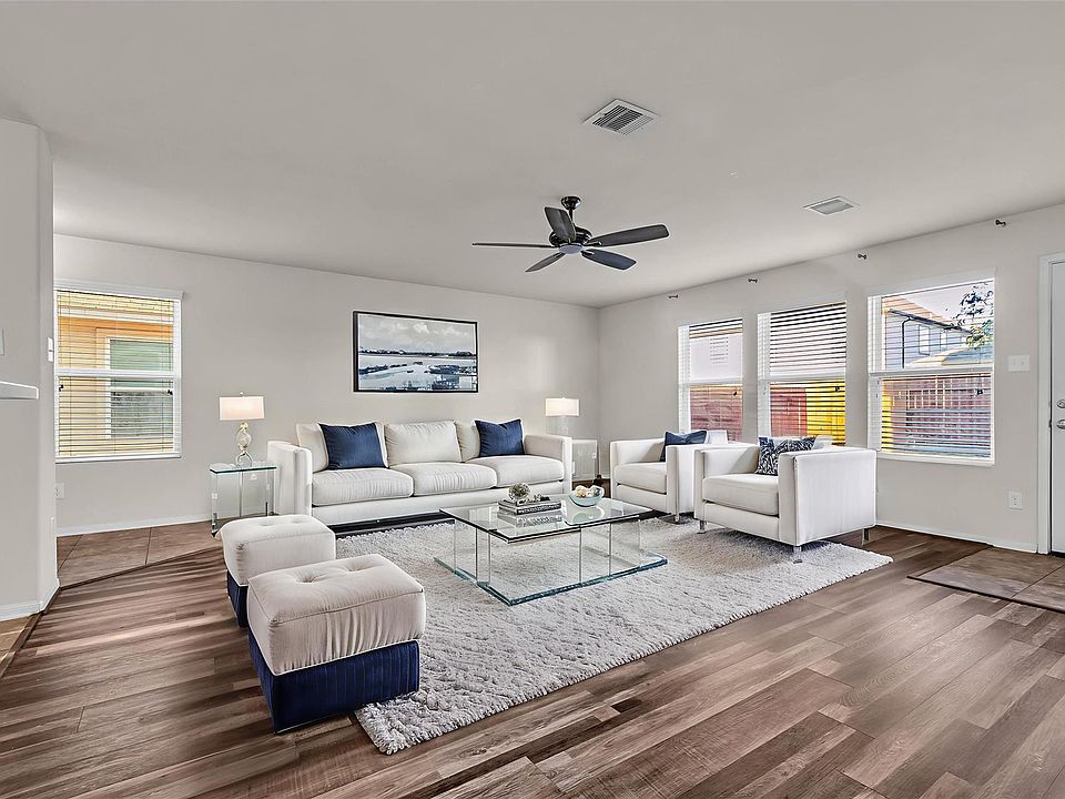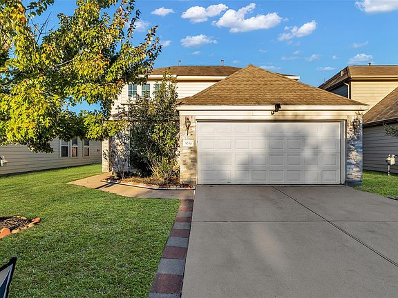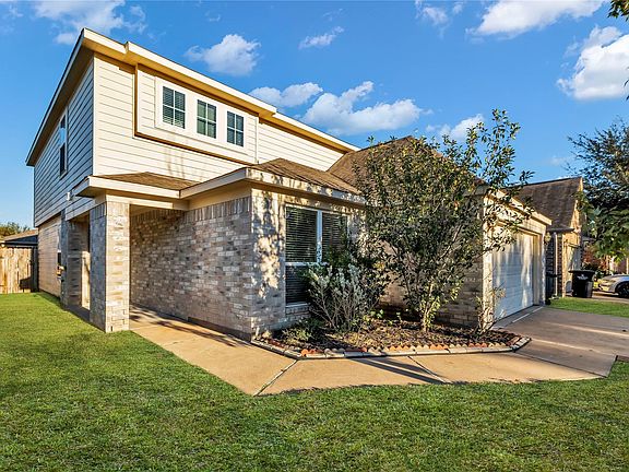 Two-story single-family home featuring 5 bedrooms, 3 full bathrooms, and a 2-car attached garage. The home offers an open-concept living and kitchen area, a formal dining room, and a spacious upstairs gameroom. The primary bedroom is located on the first floor with a double-sink vanity, separate shower, and soaking tub. Secondary bedroom also downstairs. Upstairs includes three additional bedrooms and a full bath. Exterior features include a brick and cement board facade, concrete driveway, and a fully fenced backyard.