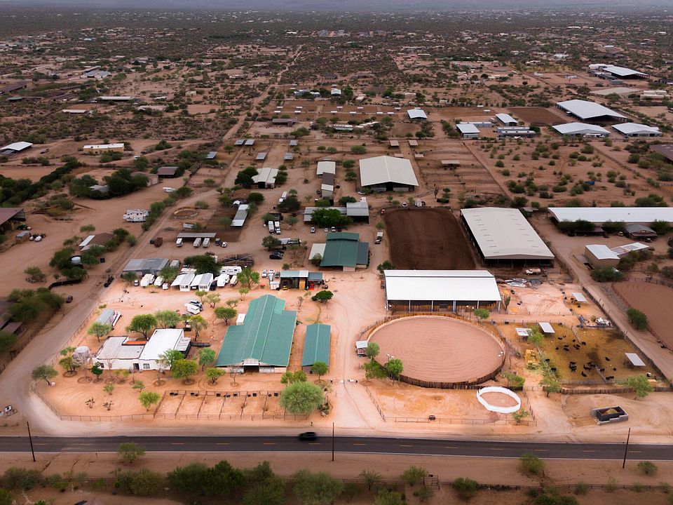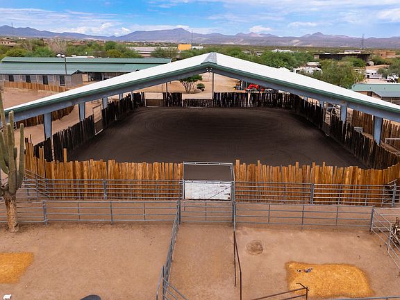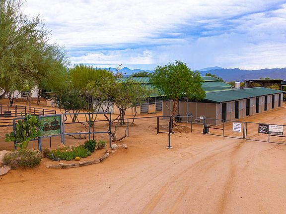 This rare equestrian estate offers 5 fully fenced acres, with a main house that is 3,097 sq. ft, 4 bedrooms, 4 bathrooms, large kitchen, office and entertainment room, with upgrades including fresh paint inside and out, a new roof, and air-conditioned garage. Horse features include two bars with a combined 47 stalls, 12 turnouts, 2 cow pens, a 150' lighted round arena, a 145' x 90' covered arena, & automatic gates at both entrances. Barns offer auto fly systems, misting systems, auto lights, and auto waters. Property also incudes 3 park model homes and four RV hookups, ideal for guests, staff, or multi-generational living. With excellent access and every amenity in place, this estate is ready for your vision, whether it's a working ranch, training facility, or your dream equestrian life.
