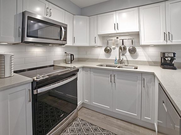 Modern timeless white kitchenUndercabinet lightsLaminate flooringIn-suite laundryCovered front patio