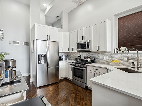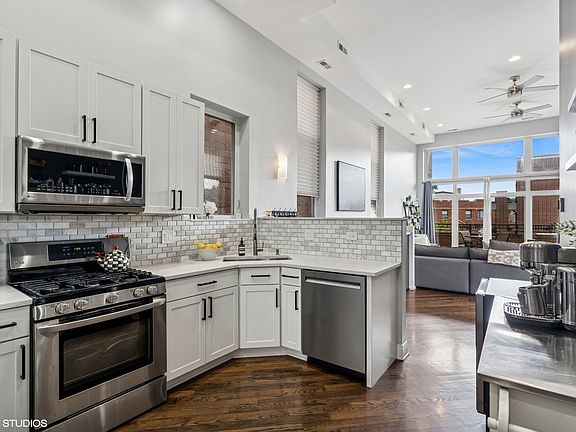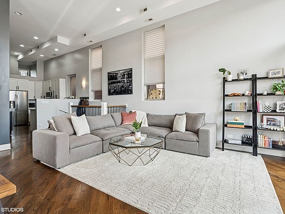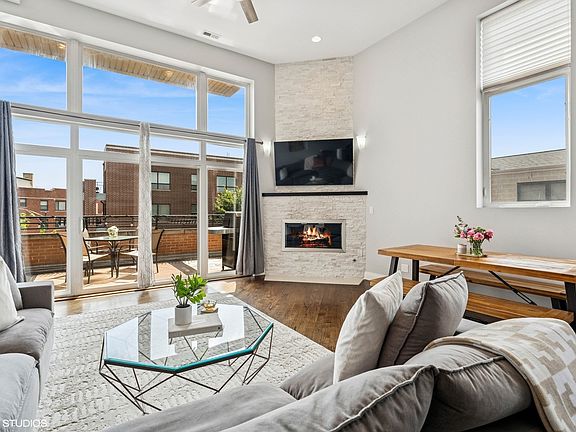 Experience elevated living in this stunning penthouse unit, offering expansive square footage and unmatched privacy. Rich oak hardwood floors in a sophisticated walnut finish flow seamlessly throughout, including all bedrooms. The main living space boasts soaring 15-foot ceilings and a striking modern stone wood-burning fireplace, creating a dramatic and inviting atmosphere. Step outside to your large private balcony-perfect for entertaining or relaxing in style. The chef's kitchen is freshly upgraded with gleaming white marble quartz countertops, 42-inch cabinetry, LED under-cabinet lighting, and an elegant marble backsplash. The luxurious primary suite features a Juliet balcony, a spa-inspired en suite bath with a walk-in shower, and a soaking tub. Two additional generously sized bedrooms offer complete privacy, along with a well-appointed second bathroom. As a true top-floor unit, enjoy exclusive access to the newly finished rooftop deck with breathtaking views of the Chicago skyline. Garage parking is included. Situated in West Roscoe Village,close to premier dining, the West 312 Riverrrun path, vibrant parks, shopping and more. Don't miss this amazing opportunity!
