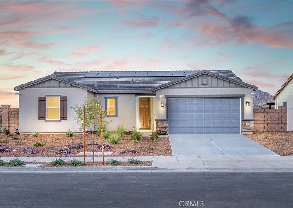 Be the first to move into this beautiful one story upgraded home The home features 9 ft ceilings designer paint and custom flooring through out The gourmet kitchen comes with custom painted cabinets, recessed lighting, large island with granite counter tops and stainless steel appliances, this is a must see open concept floor plan where the kitchen, dining and living areas are all in one great room with plenty of windows and a large slider to enjoy your beautiful Hill views This home sits on a large upgraded flat corner lot and would easily accommodate any life style you want to create The home has an office that can easily be turned into a 4th bedroom if needed The large master bedroom is separate from the other rooms for privacy and comes with a large walk in closet and beautiful upgraded bathroom with a glass door shower. The second full bathroom can accommodate the other bedrooms and guests The landscaping in the front is beautiful and drought resistant so easy to maintain you may not need the extra expense of a Gardner. Come home to your private oasis and relax your homes amenities knowing that your solar is paid for and is making your life much easier on your pocket book.