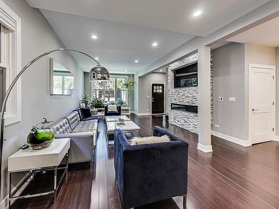 Lakeview - Prime location. This beautifully renovated single-family home on a full-size lot (25x125) with a 2-car garage offers a spacious, modern living environment with custom details and high-end finishes throughout. Thoughtfully redesigned, the home blends functionality with stylish design, ideal for both family living and work-from-home needs. Featuring 4 bedrooms plus a dedicated office, a separate custom loft with skylights, 3 full baths, and a first-floor powder room, this residence offers incredible versatility. Sunlight floods the open-concept main level, where you'll find a welcoming entry, spacious living room with a stunning gas-ventless stone fireplace, and gleaming wood floors. The Chef's kitchen is a showpiece, boasting stainless steel appliances, 42" white cabinetry, exquisite quartzite countertops, and a waterfall breakfast bar with seating for four. Upstairs, three generously sized bedrooms, a unique loft, and a bright, dedicated office with walls of windows provide abundant living options. An oversized laundry closet with full-size washer/dryer and two full baths completes this level. The primary suite impresses with vaulted ceilings, oversized windows, skylights, custom lighting, and a spa-inspired bath with gorgeous stonework, double vanities, and an oversized glass shower with dual shower heads. The lower level is built for entertaining, complete with a wet bar, beverage refrigerator, and projector with motorized screen - perfect for movie nights or game days. An additional bedroom, full bath, and ample storage complete the space. Outdoor living shines with a designer terrace featuring composite decking, stylish furnishings, outdoor draperies, and a mounted television with chandelier. The rear yard with artificial turf is ideal for both play and pets. Additional highlights include: Custom closets throughout, Dual-zoned heating and cooling with dampers, 2-car garage with electric car charger, Flood-prevention upgrades (sump pump, ejector pump, drain tiles) All of this in a prime Lakeview location, close to the CTA at Wellington and Belmont, shopping, dining, Southport Corridor, Wiggly Field Dog Park, Hamlin Park, and top-rated schools. This stunning home shows like a model and is in impeccable condition - truly move-in ready.