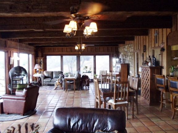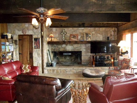 Unique stone & frame house on the lake! Beams are old railroad trestles.Fireplace is huge, Saltillo tile&windows all across the back of home w/great views of the lake.Property has a round rock boat house, along with a dock. The boat house has a built in bar bq pit,there is also a stairway to take you up on top of the house as well as boathouse to view the beautiful sunsets. Efficiency apartment