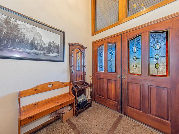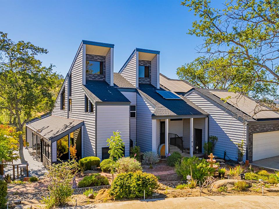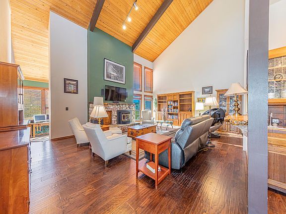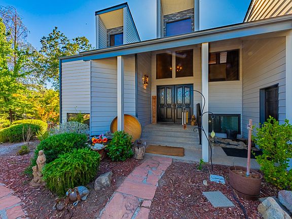 Welcome to this beautifully designed modern home, tucked away on a private 1.38-acre lot with captivating mountain views. With bold architectural lines, thoughtful design, and high-end upgrades, this home is the perfect blend of style, comfort, and sustainability.The sleek exterior features new vinyl siding, dark stone accents, 54 owned solar panels, and a Tesla Powerwall with backup battery. Inside, enjoy a bright, open layout with beamed ceilings, a stone fireplace, and surround sound. The chef's kitchen boasts granite counters, a large island, marble accents, and floor-to-ceiling cabinetry, along with a wet bar and wine cellar for effortless entertaining.Step out onto the 1,200+ sqft TimberTech wraparound deck or private balconies to soak in the views. The primary suite offers a spa-like retreat with a soaking tub, walk-in shower, dry sauna, and dual marble vanities.Additional features include a studio/office, indoor laundry, under-home workshop, central vacuum, water softener, and an automated sprinkler & drip system. The property also offers a fenced dog run, fruit trees, raised garden beds, a flex-use outbuilding, gazebo, and a 12-ft waterfall with pond.With a 2-car garage, wide driveway, and quiet setting, this is a rare opportunity to own a truly unique, energy-efficient home with timeless design and luxury living.