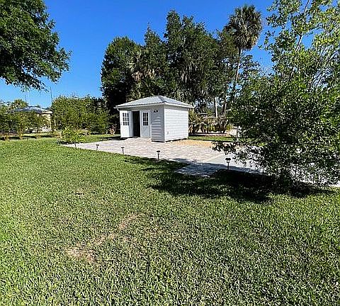This site is just steps from the Clubhouse which offers a full kitchen, bathrooms, game room, pool and heated whirlpool spa. Pad has been coated with custom epoxy decorative paint and trim, new paver patio off of the 10 x 14 building which has been fully painted inside with ceiling fan. Bamboo and red bottle brush bushes and small palms border the lot for privacy with a producing lemon tree. 30 & 50 AMP hookup.