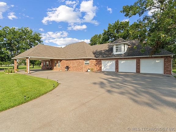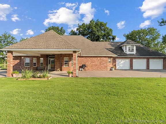 Reduced for quick sale! Beautiful custom built brick home situated on 10 acres mol dotted with mature trees many of which are pecan plus 2 ponds. This home has a large open concept living, dining, kitchen. An open main living area boasts a gas log fireplace and lots of windows overlooking 2 large ponds. You will also find a huge office/library with numerous built-ins with a separate outside entry which could easily be split and made into 2 additional bedrooms, gorgeous hardwood flooring and lots of window overlooking the property. There is a roomy formal dining area off the huge kitchen which features lots of beautiful cabinetry, an island with 2nd sink and trash compactor, lots of solid surface counter space and tiled backslashes. Just off the kitchen area there is a large wet bar area w/library paneling and a soda frig. The spacious master bedroom has a tray ceiling, gas log fireplace and french doors opening to the patio area. You will also find a large walk-in closet and roomy second closet, step-in tub, separate shower and fireplace. One hall bath is a safe room and a second hall bath between the office and 2nd bedroom has a beautiful antique style tub. Upstairs you will find another large bedroom and private bath. Extra insulation has been added to make this home energy efficient. There is also a roomy 3 car attached garage with a workspace. All this is situated on a park like 10 acres +/- just outside of Pryor with easy access to MAIP and many shopping and eating options.