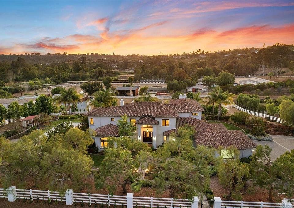 Properties like this simply don't come by very often! A newer custom built estate, with perfect South and West exposure, on a FLAT 1 acre private lot, in the sought-after West side of Olivenhain! Built in 2011 by a commercial contractor for his own family, the property borders the magnificent Olivenhain horse trail system, and offers panoramic sunset views, westerly breezes and has room for the ultimate in entertaining. Featuring multiple fruit and citrus trees, raised veggie garden beds, the "Rolls Royce of chicken coops" and an Olympic-size sand volleyball court, this property caters to the active lifestyle. If volleyball is not your thing, the south facing yard can easily be converted to allow for a pickleball court, a large grassy area for playing games, and a new POOL. There is room to add an ADU (2 possible locations) - but you may not need to as the current layout of the house offers the perfect guest suite, with its own private entrance already. The gated property is on a private tree lined street and is the perfect 'trail head' for hiking or biking the renowned Spooks Canyon and its winding river trail. The custom home features soaring ceilings throughout that create an ambiance of grandeur and space, with a junior primary suite downstairs and an elegant over sized second level primary suite. The heart of the home is the great room featuring a large kitchen island ideal for both meal preparation and casual dining, along with top-of-the-line Wolf double ovens, a gourmet Wolf gas range, and a Sub Zero fridge/freezer. Flowing seamlessly from the kitchen is the inviting family room, complete with a stacked stone fireplace and sweeping views, ideal for relaxed gatherings or intimate moments. From the dining room, French doors open to the back patio for al fresco dining! A optional bedroom/office completes the downstairs. Upstairs you'll find two secondary bedrooms, a huge open loft and a flex room that could also serve as a bedroom with a small modification. Convenience meets luxury with whole house water filtration, a mudroom (with a DOG SHOWER), laundry room and the 3-car garage that easily fits an oversized truck (approx 30 feet in depth), providing ample storage and functionality for modern living. The home lies in the acclaimed Olivenhain Pioneer Elementary school district and provides easy access to the shopping and restaurants in Encinitas just minutes away.