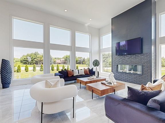 Second fireplaceTiled linear fireplaceCustom wet barStacked stone wallHidden pantryHigh-end appliancesCustom shades