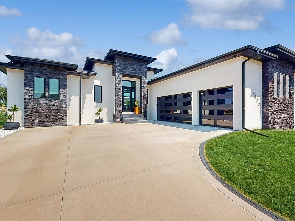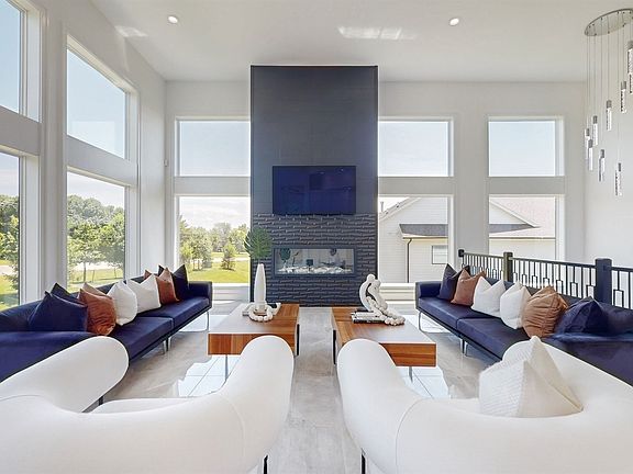 Indulge in the refined allure of this stunning walkout ranch, where elegance abounds inside and out. Beyond the custom front door, discover 14' ceilings, a tiled linear fireplace, and floor-to-ceiling windows that bathe the living space in natural light. 15x30 tile flooring flows throughout, accentuating the open stairway with a tiled wall, custom lighting, and metal railings. The kitchen is a gourmet chef's dream! Huge center island, ample counter space, a hidden pantry, and high-end appliances. The primary suite boasts a boutique closet, en suite bath with vessel sinks, a stacked stone wall, and a tiled walk-in shower. Natural light continues to bathe the lower level with an open stairway, a second fireplace, custom wet bar, powder room, and sliding doors to the lower patio. Two bedrooms, each with their own huge walk-in custom closet, share a dual-sink vanity bath with a whirlpool tub. Outdoor spaces include a deck off the dining room and two lower patios. Custom shades, dual zone HVAC, and epoxy garage flooring complete this impeccable home—a masterpiece of luxury and comfort.