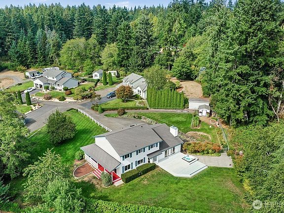 Welcome to this picture perfect Poulsbo retreat on nearly half an acre in the Clear Creek community. With 4 bedrooms, 2.25 baths, and 2,100+ sq ft, this home is filled with natural light from vaulted ceilings, skylights, and large windows. The main floor offers a spacious living room, dining area, and fully upgraded kitchen that opens to a cozy family room with wood stove. French doors lead to a generous deck overlooking your private, park-like yard. Upstairs, the primary suite features a walk-in closet and private upgraded bath, with three more bedrooms for guests or hobbies. Updates include vinyl plank flooring, fresh finishes, 2 heat pumps with A/C. Enjoy fruit trees, hot tub, RV parking, and cul-de-sac location minutes from town.