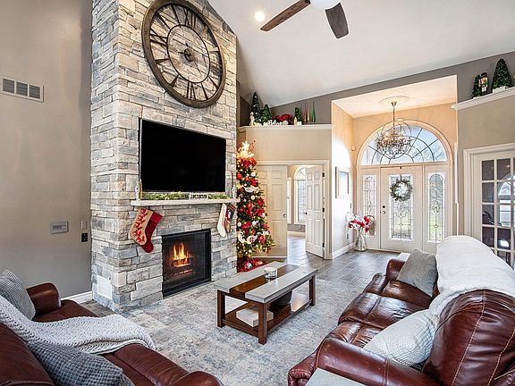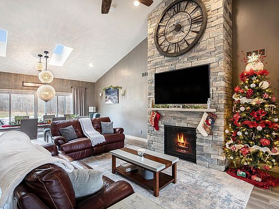 Welcome to an exceptional home designed for both relaxation and unforgettable gatherings. Nestled on a peaceful cul-de-sac, this stunning property blends modern luxury with thoughtful functionality - inside and out. Main Level: Step into the expansive open-concept great room, where cathedral ceilings, 2 skylights, and a dramatic floor-to-celing stone fireplace create a warm, inviting atmosphere. A doorwall opens to the outdoors, filling the space with natural light and offering a seamless flow for entertaining. True chef's kitchen with an oversized, granite island, 2 pantries and plenty of counter space for dining, serving guests or baking. The primary suite is a true retreat with a massive ensuite featuring a spa-like soaking tub, double sink vanity, tiled shower room and a custom walk-in closet with its own washer and dryer. A second bedroom can serve as a beautiful office or extra sleeping space for family and friends. Durable, stylish seamless tile flooring runs throughout the main level for a clean, elevated aesthetic. Walkout Lower Level: Perfect for guests, kids or multigenerational living, the walkout basement offers: * 2 spacious bedrooms * A beautifully designed full, tiled bath with walk-in shower * Cozy family room with built-ins and a fireplace * Dedicated play area with desk for crafts or homework * Theater room with screen and projector * Extra storage room with shelving and additional closet space * Custom built-in playhouse with a slide that leads to a dog room. The dog room opens to a fenced-in area, creating the perfect indoor-outdoor flow for your four-legged family members. Outdoor Oasis: Designed for year-round enjoyment, the exterior features: * Massive deck space with multiple access points for gatherings * Paver Patio surrounding a charming fire pit - the perfect spot for evenings under the stars * Nearly an acre of land with wildlife visitors from the wooded area in the back Garage & Workshop: A true bonus: the attached 2 car garage includes a separate heated workshop area plus storage space, ideal for hobbyists, DIYers, or extra gear. This remarkable home at 3055 Shyre Circle offers luxury, comfort, and creative custom touches you won't find anywhere else. Whether you're hosting a crowd or enjoying peaceful everyday living, this entertainer's dream is ready to welcome you home.