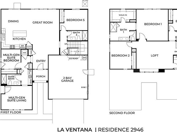 The Plan 2946 square foot MultiGEN home has a separate private entry off the front side of the home that leads to the suite's lounging area with kitchenette, a stackable laundry closet and bedroom with full bathroom. Also downstairs in the main home is an open concept Great room, dining area, island kitchen with breakfast bar, Quartz counter tops, stainless steel appliances, and pantry closet, a guest bedroom and full bathroom. Upstairs, the primary bedroom has an ensuite and walk-in closet, a large loft, laundry room with folding counter, two additional bedrooms and full bathroom. There is white shaker-style cabinetry throughout. This home has Smart Home technology, solar panels installed, and a 2-car garage pre-plumbed for an electric car. The home is also fully irrigated and landscaped in the front yard. We anticipate the home will be ready for move in mid-April of 2026. This is an all-electric community.