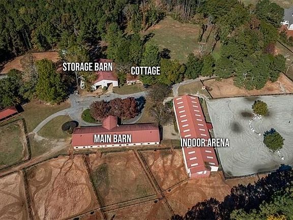 Welcome to Wisteria Farm, a premier 30-acre commercial training and boarding facility designed for serious equestrians, competitive riders, and professional trainers. Purpose-built with top-tier amenities and an exceptional layout, this operational horse farm offers the ideal combination of function, comfort, and world-class infrastructure. At the heart of the property are three meticulously maintained barns featuring 29 matted stalls, automatic waterers, hot and cold wash racks, dedicated tack, feed, and laundry rooms, and a 750-bale hayloft with additional flat storage for equipment and supply management. The barns are supported by a professional fly spray system, a welcoming lounge with TV, and a convenient on-site restroom, ensuring comfort for clients, riders, and staff. Training facilities are truly exceptional. The 180' x 70' lighted indoor arena is equipped with timed sprinklers and potential geothermal HVAC, ensuring year-round rideability and an ideal training environment. The expansive 200' x 300' outdoor arena features premium 10-foot lighting, arena lights, perimeter and center sprinkler systems, integrated shade trees, a sound system, and a viewing deck perfect for lessons, clinics, or shows. Additional training amenities include an 80-foot round pen, a derby hill with three permanent jumps, and bridle paths that wind throughout the property. For housing or staffing needs, the property includes a renovated two-bedroom cottage, well suited for trainers, grooms, or working students. With its exceptional design, thoughtful amenities, and proven functionality, Wisteria Farm stands as one of the region's premier equestrian facilities ideal for boarding, training programs, competition prep, or expansion into larger commercial operations: Think pet boarding facility, animal rescue farm, rehabilitation facitility, recreational farm for those with special needs: the options are endless!
