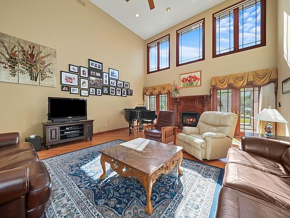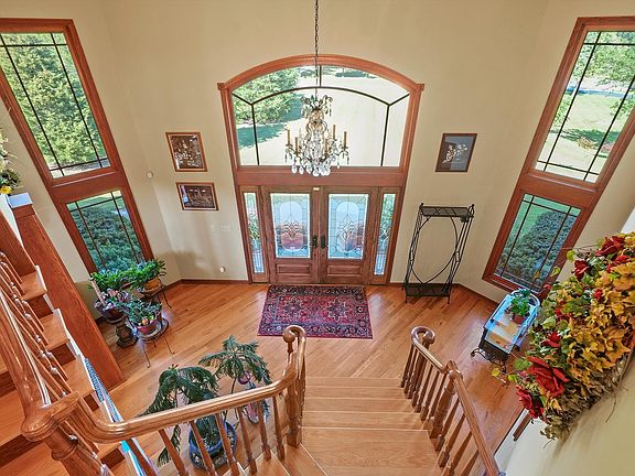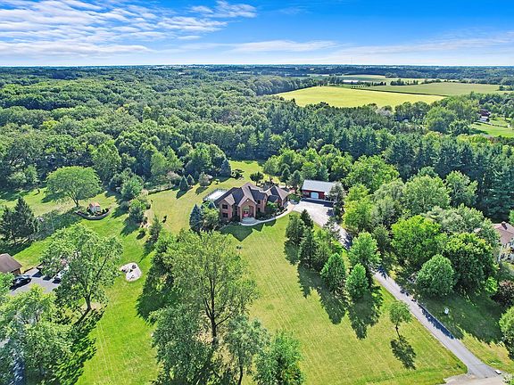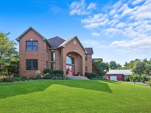 MAJESTIC 4 BEDROOM/3.5 BATH CUSTOM HOME with OUTBUILDING, meticulously constructed with every attention to detail, all set high on 2.57 ROLLING ACRES! ~ UNIQUE ARCHITECTURAL DESIGN & floor plan, incredible SPACE & FLEXIBILITY, over 4300 FINISHED SQUARE FEET, and classic HIGH-END FINISHES combine to make this ORIGINAL OWNER home truly one-of-a kind ~ Curved front steps & double entry doors lead to the expansive DRAMATIC & light-filled 2-STORY FOYER ~ ENORMOUS 2-STORY LIVING ROOM boasts an awesome wall of windows (w/remote-controlled shades), fireplace w/custom CARVED MANTEL & granite surround flanked by french doors, and GRANITE WET BAR w/cabinetry ~ KITCHEN & BREAKFAST ROOM feature gorgeous granite countertops, loads of cabinets (some glass fronted), an island, commercial-grade STAINLESS STEEL appliances (including 2 ovens, oversized cooktop, stove hood w/warming lights & shelf, & built-in microwave), and VAULTED WOOD CEILING ~ GENEROUS DINING ROOM provides plenty of entertaining space, and opens onto the living room ~ Main floor OWNER'S SUITE includes private bath with soaking tub/separate shower/double sinks, dual walk-in closets, and SITTING ROOM WITH NATURE VIEWS & patio access ~ IMPRESSIVE STAIRCASE leads up to two walkways & overlooks, secondary bedrooms featuring a balcony / walk-in closet / window seat / walk-in storage room, and full bathroom with double sinks & soaking tub ~ MASSIVE BASEMENT offers a family room, play area, full bathroom, storage rooms, crawl space, & 2nd staircase ~ Don't forget the main floor office, main floor laundry, separate mudroom, & ATTACHED 2.5 CAR GARAGE w/attic ~ Note the ALL-BRICK EXTERIOR, miles of HARDWOOD FLOORING, beautiful custom millwork, 9 ft & vaulted ceilings, two furnaces & A/C units, new natural gas generator, & reverse osmosis system ~ 30x45 MORTON OUTBUILDING features covered patio, overhead & service doors, cement floor, & 2 lofts ~ OUTDOOR LIVING includes stamped concrete PATIO w/curtained gazebo, huge above-ground POOL, Amish oak GAZEBO, & fenced produce garden ~ RESORT-LIKE SETTING makes for a SERENE RETREAT with STUNNING VIEWS of rolling land, plentiful & varied mature trees & perennials, and quiet country living... yet near x-way, quaint downtown Crete, & Indiana shopping ~ YOUR SLICE OF PARADISE AWAITS!