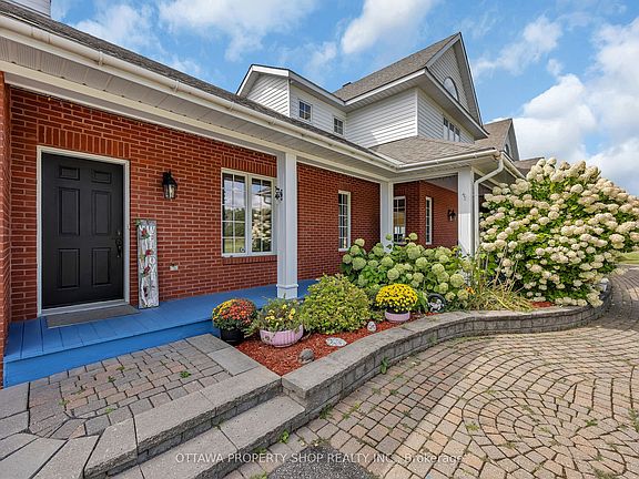 Offering breathtaking views, spectacular sunsets, mature trees, a winding approach, and extensive landscaping, this attractive residence captures the best of both worlds: the seclusion of the country, yet just minutes to the conveniences of Kanata and Ottawa all with the luxury of fiber-optic internet in the countryside. Set on 25.55 acres plus an additional 2-acre parcel with separate title that could be used to built another home, sell or meet as an investment, this extraordinary estate blends privacy, elegance, and modern comfort. The impressive approximately 4,700 sq. ft. home showcases timeless architectural details, abundant natural light, and a thoughtful layout. At the heart of the home is a gourmet kitchen, thoughtfully designed with maple cabinetry accented by crown molding, sleek Corian countertops, glass-front cabinets, and a center island with breakfast bar. Smart features such as a microwave sling, lazy Susan, desk nook, bread pantry box, and extensive storage solutions enhance both function and style. The main level also features elegant double French doors, expansive principal rooms, and a cathedral-ceiling primary suite with extensive closets and a spa-inspired ensuite with double vanity, oversized shower, and tiled floors. Upstairs, two staircases lead to three generously sized bedrooms, each enhanced by vaulted ceilings, Palladian windows, and balcony access with sweeping views of the property. The walk-out lower level extends living space with a recreation room, games area, hobby room, office/den a full bath with oversized shower, and ample storage. Patio doors open to a 20 x 30 interlock stone terrace, seamlessly connecting indoor and outdoor living.