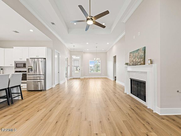 Welcome to the exclusive Langlinais Estates! This stunning home offers a triple split, open floor plan designed for both functionality and style. Just two years young and better than new, it features thoughtful custom upgrades throughout, including plantation shutters, gutters, designer finishes, and more.The spacious living room showcases a cozy gas ventless fireplace, while the gourmet kitchen flows seamlessly for easy entertaining. Step outside to a true outdoor retreat--complete with a second fireplace, built-in gas grill, sink, bar area, and custom tile flooring for a high end look and feel. With remote-controlled custom screens, the back patio can be enjoyed year-round as a private extension of your living space. Enjoy the spacious backyard with a beautiful tree lined view behind a full privacy fence. Light-filled and airy, this home is perfect for modern living with four bedrooms and three full baths that provide privacy and functionality. Conveniently located in sought-after Langlinais Estates, you'll be close to Acadiana's best shopping, dining, and amenities! This price point is rare in this community so call today to appreciate all it has to offer!