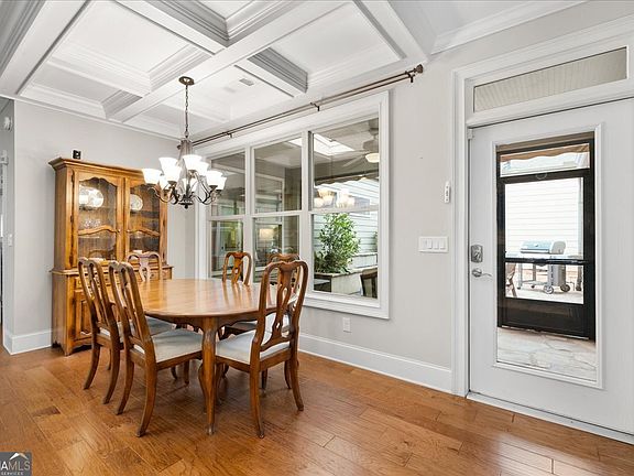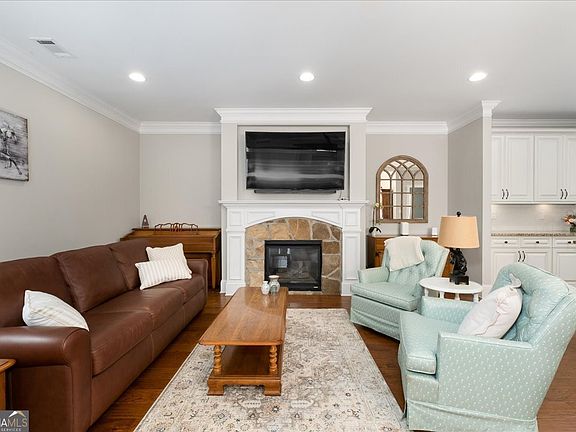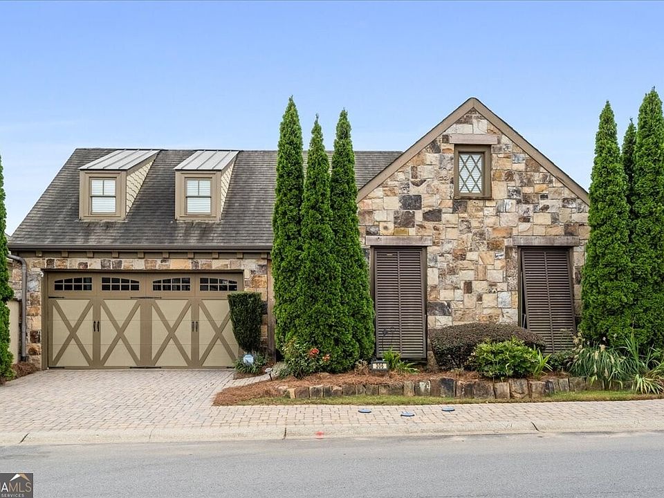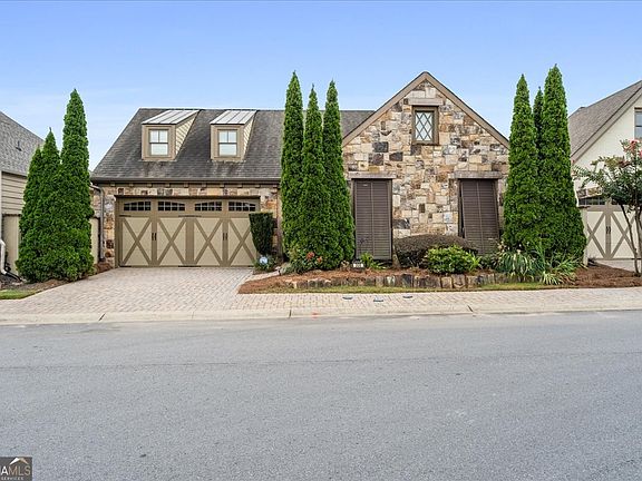 Welcome to this stunning European-inspired home in the gated community of The Village at Towne Lake. With a charming stone front and Bermuda shutters, this residence offers true one level living with no carpet and full handicap accessibility. Inside, the home boasts four spacious bedrooms and two and a half baths, all designed for both comfort and style. The open concept layout features a defined great room with a cozy gas log fireplace, a dining area with an elegant coffered ceiling, and a huge designer kitchen complete with an oversized island, gas range, built-in microwave, white cabinetry, and granite countertops. The primary suite offers ample space, including a sitting area, a luxurious bathroom with zero-entry shower, dual vanities, and an oversized walk-in closet. Both full bathrooms are fully wheelchair accessible. A dedicated office space sits conveniently off the kitchen, while the separate laundry room with sink adds everyday functionality. Additional highlights include: Reverse osmosis water system Two-car garage with an innovative attic elevator lift system for effortless storage access Screened porch leading to a private courtyard with a soothing water feature and retractable electric awning. Community amenities elevate the lifestyle even further with a pool, pickleball courts, and a grand clubhouse featuring a pool table, game area, kitchen, and abundant space for social events. Residents enjoy an active community with clubs, gatherings, and game nights.Perfectly located just minutes from top-rated schools, the interstate, and the vibrant charm of downtown Woodstock.