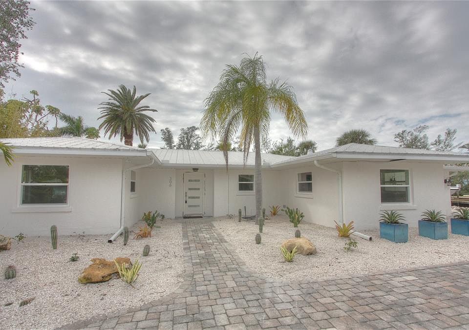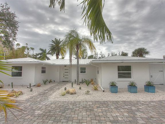 Available now. Lovely pool home with canal water frontage located in Siesta Key's peaceful and secluded neighborhood of Palm Island. Completely renovated with new kitchen, bathrooms, and floor coverings throughout this island retreat. Walk four blocks to the crystal sands of world famous Siesta Beach, and just a short walk to the Village. Beautiful backyard with spacious patio, heated swimming pool/spa and boat dock with lift.